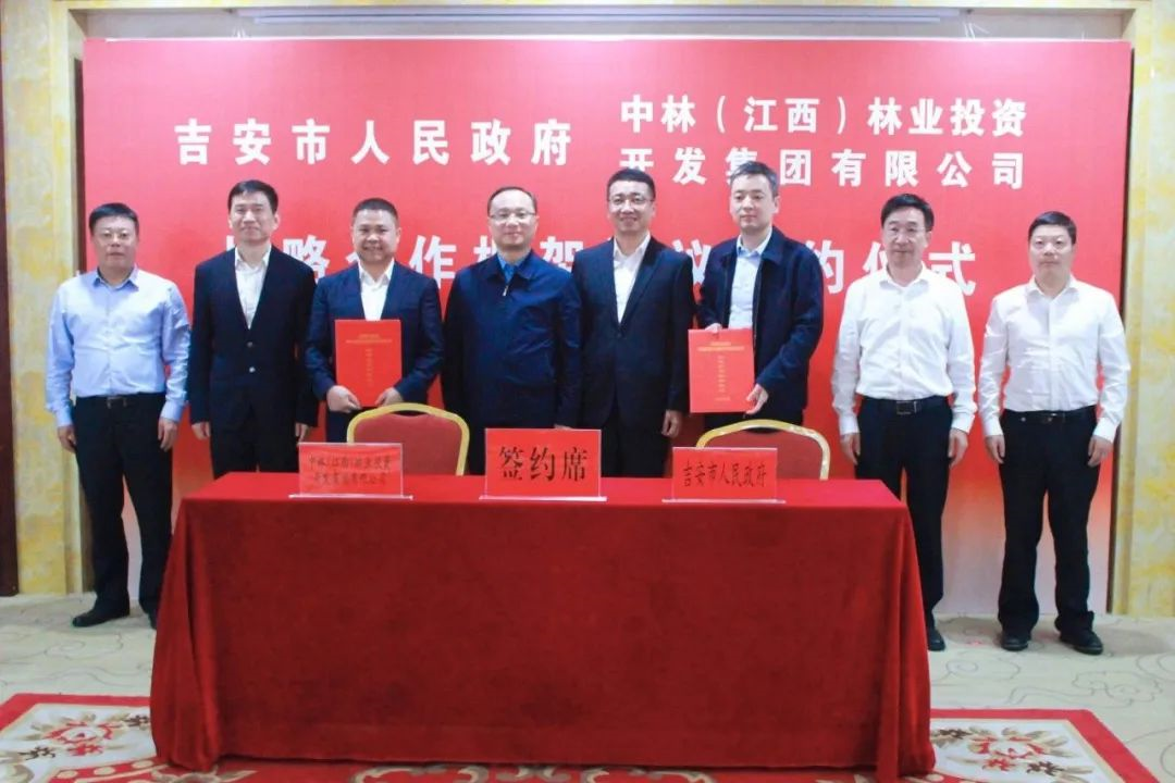 10月11日,中林集團所屬中林贛投集團與吉安市人民政府簽約戰略合作框架協議。根據協議,雙方將合作共建國家儲備林200萬畝、高產油茶100萬畝,并在國土綠化、林下經濟、林業碳匯、林業科研與技術推廣等重點領域開展合作,發揮林業多重效益示范作用,提升森林經營效益,推動吉安市林業高質量發展。吉安水秀山明,林木蔥郁,擁有廣袤的林地資源,林地保有量穩定在2582.55萬畝,森林覆蓋率穩定在67.7%,活立木蓄