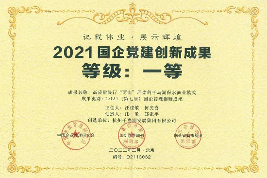 近日,杭州千島湖發展集團有限公司《高質量踐行“兩山”理念的千島湖保水漁業模式》課題成果,獲評2021(第七屆)國企管理創新成果(案例)第一等級,這是對千島湖生態漁業模式創新工作質量和水平的高度肯定。