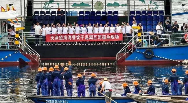 戰(zhàn)略合作簽約前,天津望海灣餐飲管理公司一行來到千島湖有機(jī)魚生產(chǎn)基地,開展了有機(jī)魚尋根探源活動,深入了解千島湖淳魚生產(chǎn)過程及生長環(huán)境,觀看“中華一絕——巨網(wǎng)捕魚”,考察淳魚鮮凍產(chǎn)品加工廠,參觀千島湖魚博館,不僅切身體驗(yàn)到千島湖淳牌有機(jī)魚的高品質(zhì)和內(nèi)涵深遠(yuǎn)的千島湖魚文化,更是對千島湖生態(tài)漁業(yè)模式有了更深入的理解。