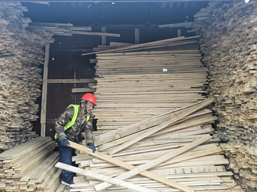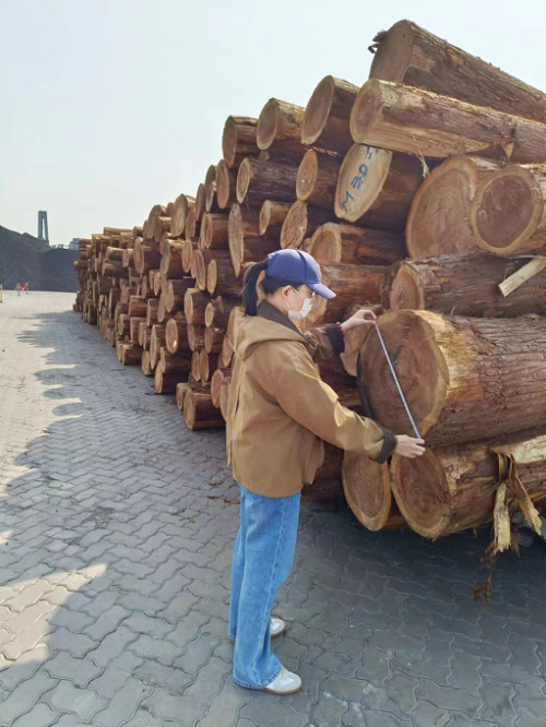 質量管理 測量先行 林場集團所屬大連中林投資有限公司業務部職員正在檢尺圓木,以確定規格,進行準確分類。(攝影:歐陽瑩)