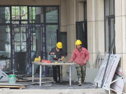 凝心聚力 鑄就品質 林場集團所屬成都市中林投資發展有限公司建設項目——成都青白江鐵路港木材物流基地,工人正在對綜合樓墻面的門窗進行加工作業。(攝影:管思遠)