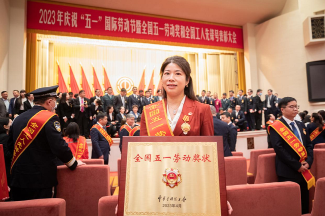 全國(guó)勞動(dòng)模范晏文娟作為中林集團(tuán)代表,在人民大會(huì)堂領(lǐng)取全國(guó)“五一勞動(dòng)獎(jiǎng)狀”。