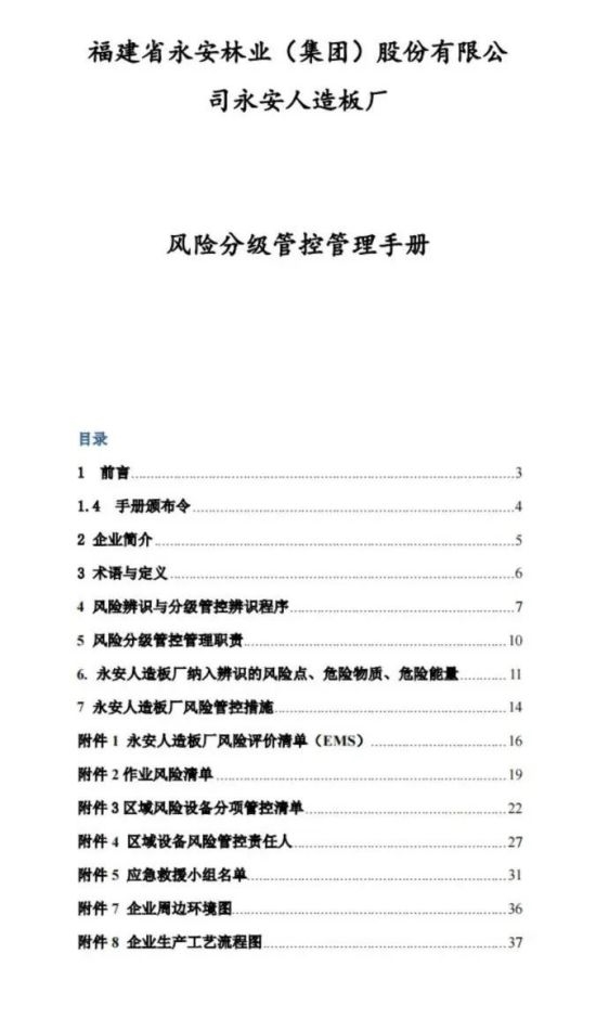 中林控股所屬永安林業人造板廠積極完善年度《風險分級管控管理手冊》,并以此作為干部職工安全、規范開展生產管理工作的行動依據。管理人員可依據手冊內容,明確不同區域、作業內容的風險等級以及個人所屬的管控管理職責,來制定針對性管理措施。目前,該手冊已成為永安林業人造板廠建立健全風險分級管控與隱患排查治理雙預防機制的重要組成部分,為其實現安全高效生產提供了有效助力。