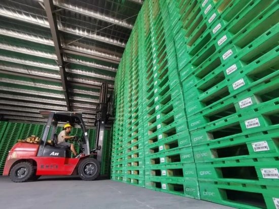 產業園倉庫內的木托盤整齊碼放,白色塑料片內有智能芯片